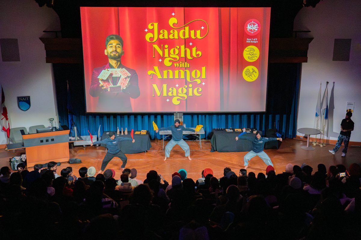 Tanroop Mahal, a NAIT student and Ooks Life Promotions Coordinator, opens Jaadu Night at NAIT’s Shaw Theatre, introducing the performers.Three dancers perform on NAIT’s stage, opening Jaadu Night with a high-energy routine in front of a full auditorium.Gunraj Singh (red), Savneet Singh (yellow) and Arshdeep Singh (blue) perform a Bhangra routine with traditional rumāl (decorative scarves) during the opening act of Jaadu Night at NAIT.Magician Anmol Magic takes the Shaw Theatre stage to begin his performance at Jaadu Night at NAIT.Anmol Magic reveals his Rubik’s Cube after matching a randomly mixed cube handled by an audience volunteer, completing the trick in seconds with his eyes closed at NAIT’s Shaw Theatre.Anmol Magic hugs an audience volunteer who unknowingly selected a “hug” card instead of one of several prize options during one of the Jaadu Night tricks at NAIT. Anmol Magic pours milk from a sealed Coca-Cola can after appearing to guess the volunteer’s chosen drink incorrectly at Jaadu Night at NAIT.Audience members react with laughter and surprise during a magic trick performed by Anmol Magic at NAIT.Anmol Magic reveals a colour-matching trick, showing his outfit matches a random combination selected earlier by an audience member at NAIT’s Shaw Theatre.The audience gives a standing ovation as magician Anmol Magic bows at the end of Jaadu Night at NAIT’s Shaw Theatre.