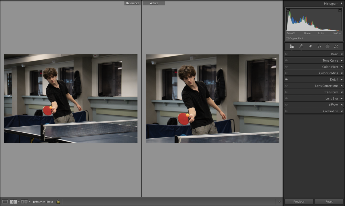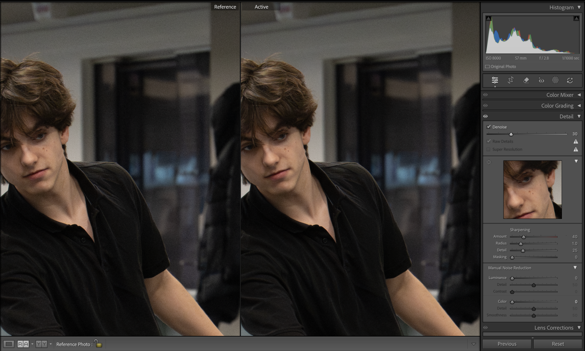Fast shutter speeds often create noisy images. Before making other edits, apply “Denoise”. A moderate amount, around 20 to 30 per cent, usually removes grain without losing too much detail. The difference isn’t very noticeable just yet.